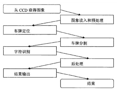 车牌号码识别在自动收费系统、追踪逃逸、被盗车辆、公路卡口管理、电子警察等方面都有广泛的应用。例如仓库活动目标的自动监视、码头自动监视、火车轧道口的自动监视等。车牌识别技术大致的流程如图所示: