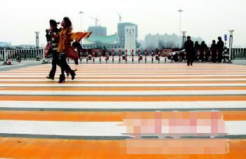 沿着已经施化好的彩色反光斑马线,负责人丁先生带着两辆车施化白色斑马线。他说,最初在牧校门口施化的彩色斑马线是冷漆技术,就是在路面上喷上一层似油漆的物质,但明显磨损得太快。而现在铺设的黄白斑马线全部运用了新的热熔技术,能够使颜料附着在路面上,并形成0.2至0.3厘米的厚度,使用寿命大大延长,可达24个月左右。