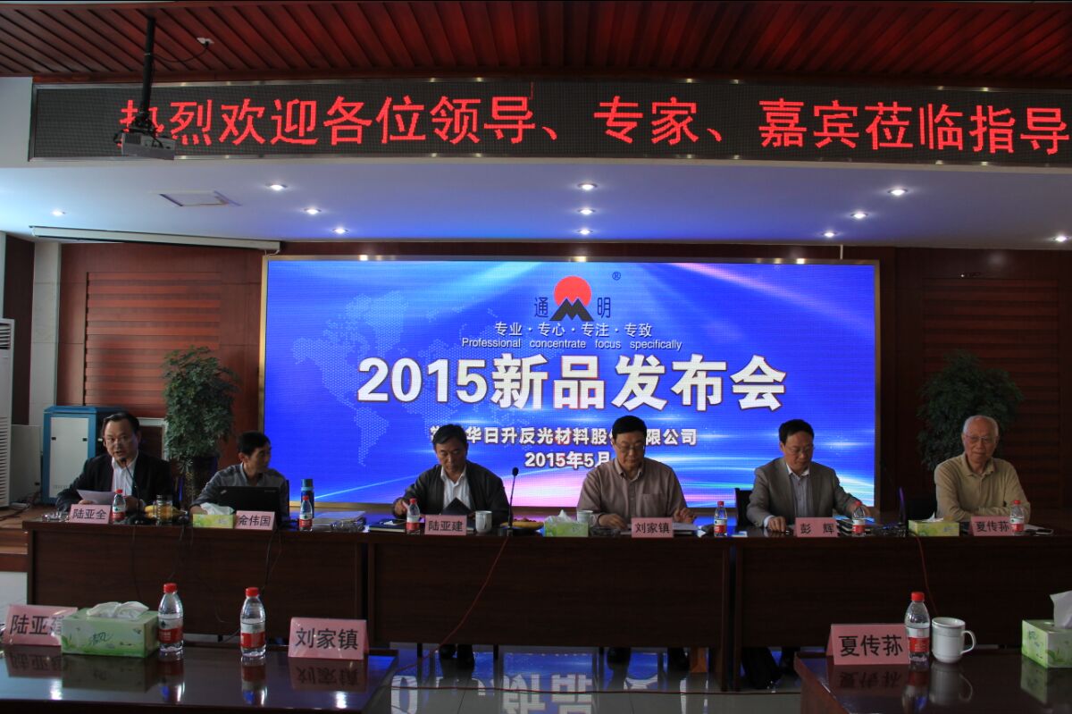 2015年5月12日上午,以“专业·专心·专注·专致”为主题的华日升2015新品发布会在公司中会议室隆重举行。“通明”牌微棱镜系列反光膜产品正式发布。会议盛邀公路司司长刘家镇、长安大学教授彭辉和标志标牌专家夏传荪出席,反光材料行业的相关加工商、经销商等50余位嘉宾也参加了此次新品发布会。
